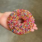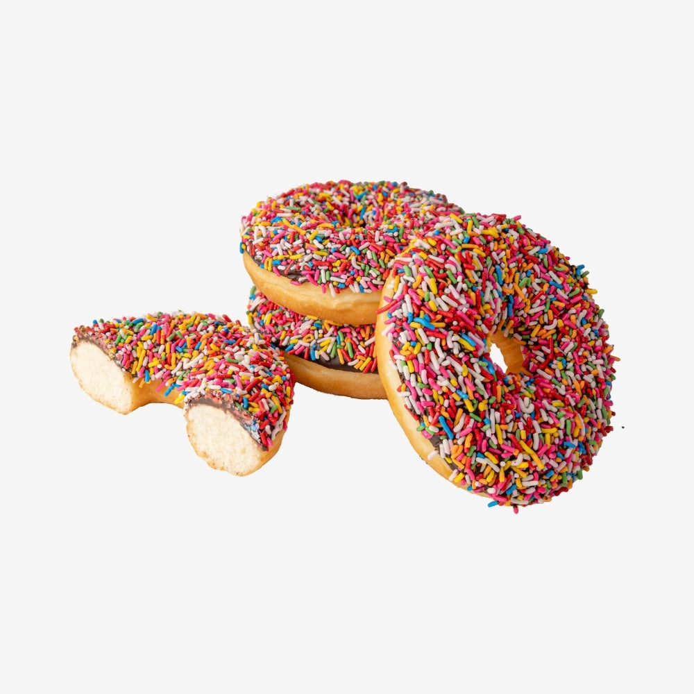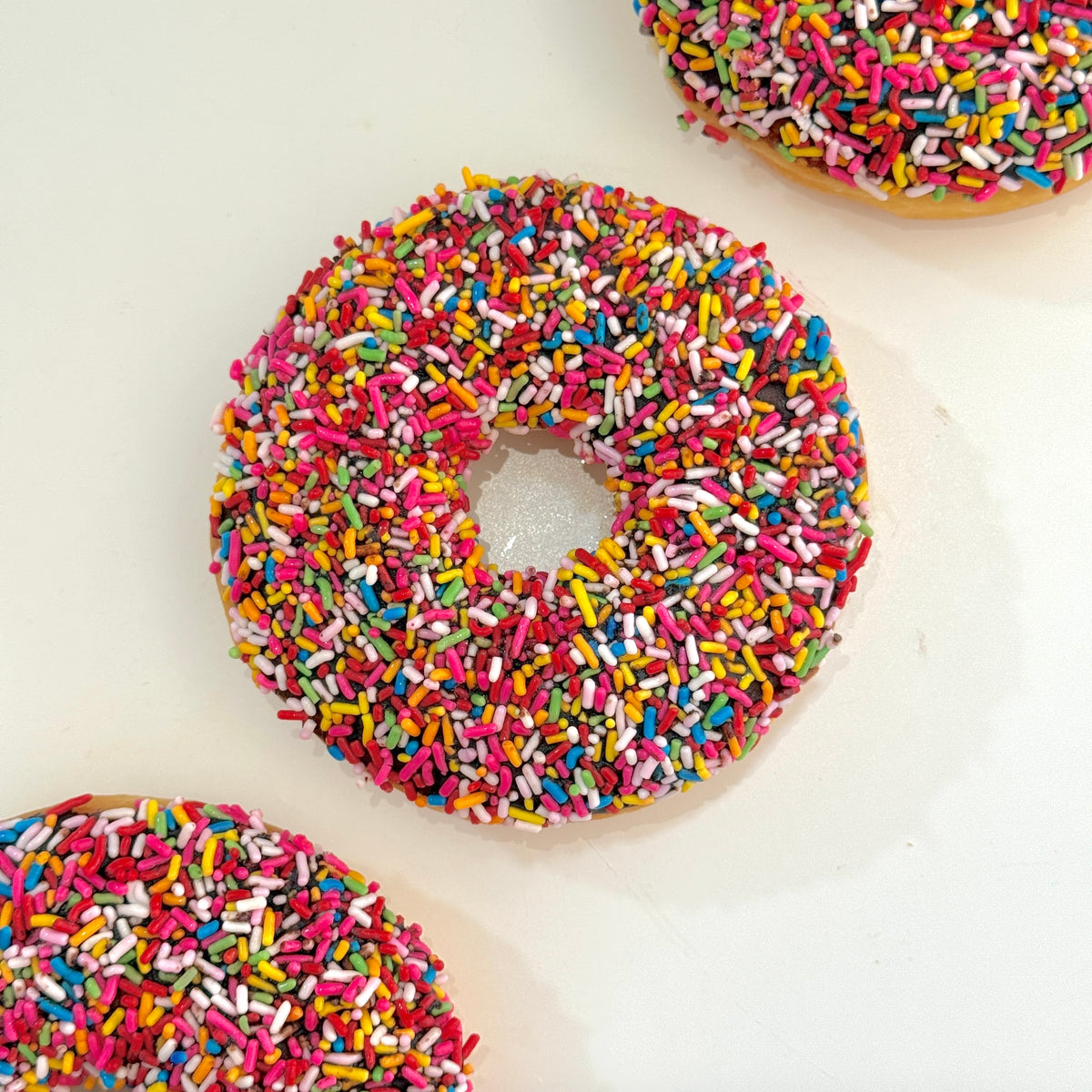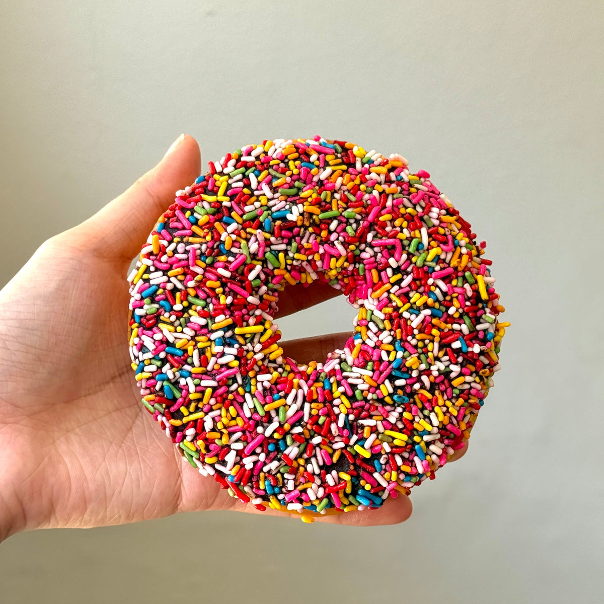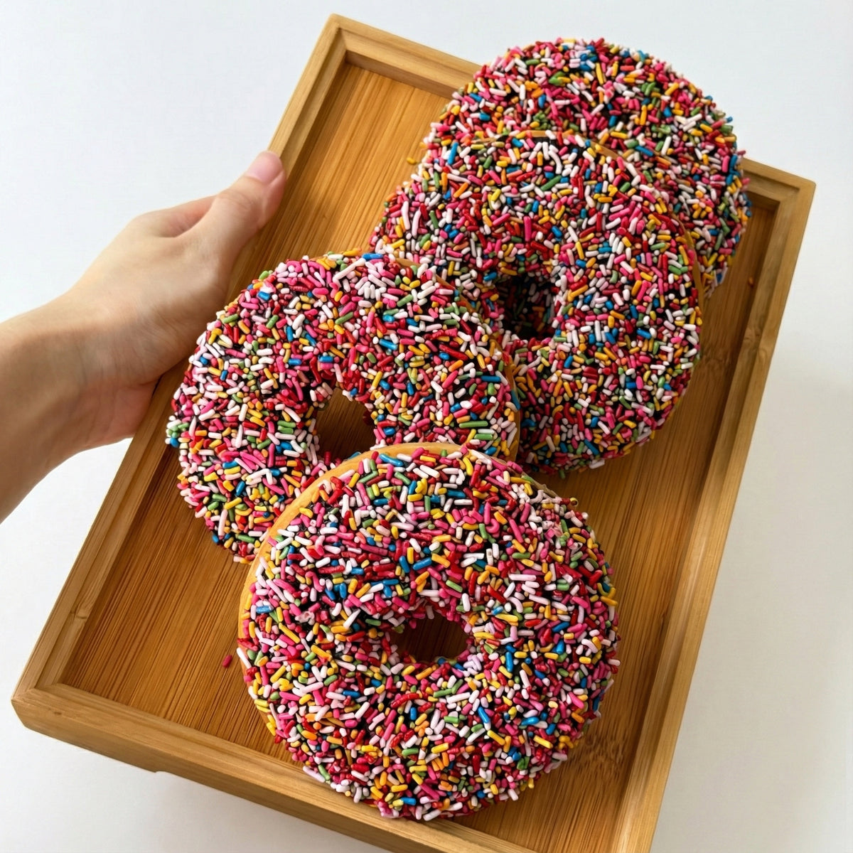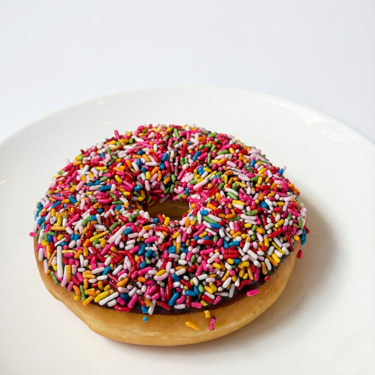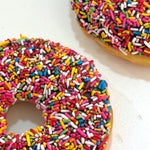 Soft donut coated in glaze and colorful rainbow rice - a playful, cheerful treat that’s as fun to look at as it is to eat.